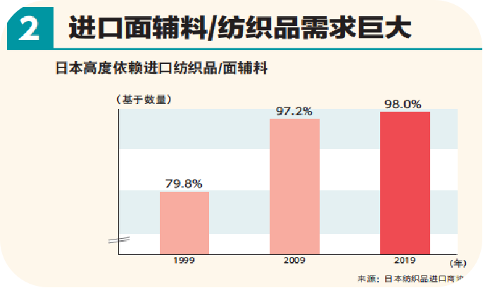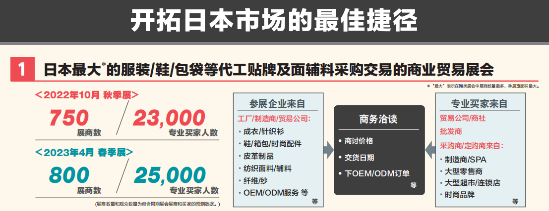 参加日本国际服装及鞋包展是通往亚洲******服装及鞋包进口市场之一 ——日本市场(总市场价值为1364 亿美元),最有效的途径。根据中国海关最新数据,中国是日本******的服装及鞋包产品进口来源国。日本拥有1.3亿人口,平均工资22300元/月,是我国平均工资的5倍。日本人对生活较为“讲究”不同场合需要不同着装,且有定期更换服装及鞋包产品的习惯,使得日本人对于服装及鞋包产品有巨大的需求。