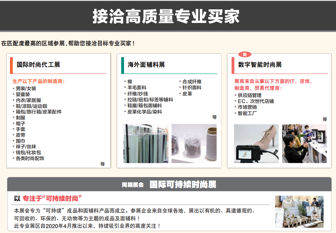 展会汇集来自全球的1,000家参展商,集结最新可持续时尚,潮牌男装女装、箱包、鞋靴、饰品配件、面料辅料、时尚科技相关产品,是中国企业开拓日本时尚市场的******平台。